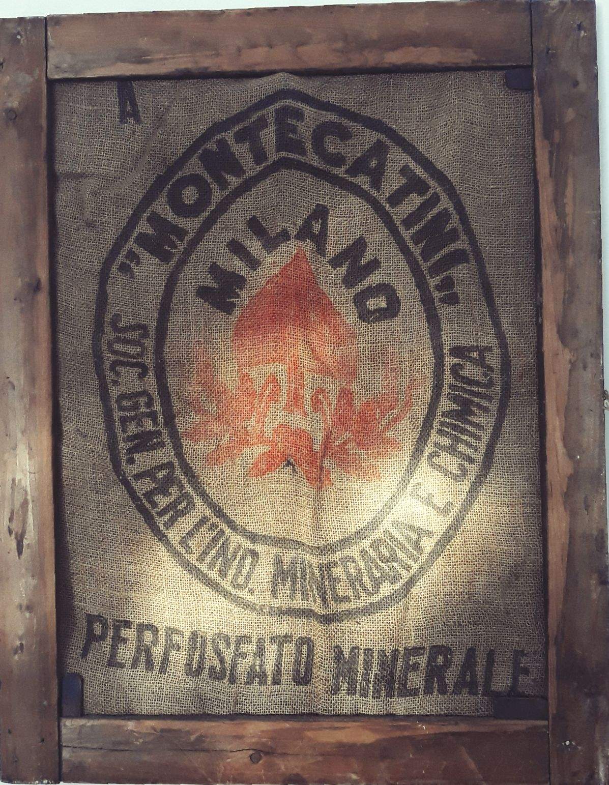 Popo Art - Opera realizzata su telaio di un antico quadro fiammingo XIX secolo con autentico sacco anni 50 della "Montecatini - Milano" Società Generale per l'Industria Mineraria e Chimica.